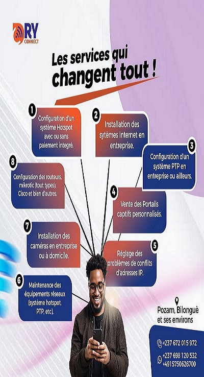 Fondé en 2022, DRY-CONNECT est un opérateur Wi-Fi local qui fournit des solutions Internet haut débit pour les familles, les étudiants, et les petites entreprises. Basés à DOUALA, nous nous efforçons chaque jour de connecter les communautés grâce à un service de qualité, accessible et fiable.